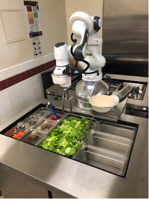 模仿实际厨师的动作,机器人使用人工智能和计算机视觉来操纵餐具并抓取预定数量的沙拉配料,将它们组合成碗并包装出售。Johnson 说:“它让我们可以像他们一样做饭,所以我们不会改变流程。”。他说,像人类一样使用餐具对于让食物达到人们期望的效果很重要。他说,以不同的方式烹饪。“改变了口味,有时大,有时小……它已经进行了数十万次学习如何舀西红柿、学习莴苣莴苣的试验。你不会相信你可以轻易地挫伤芝麻菜。”