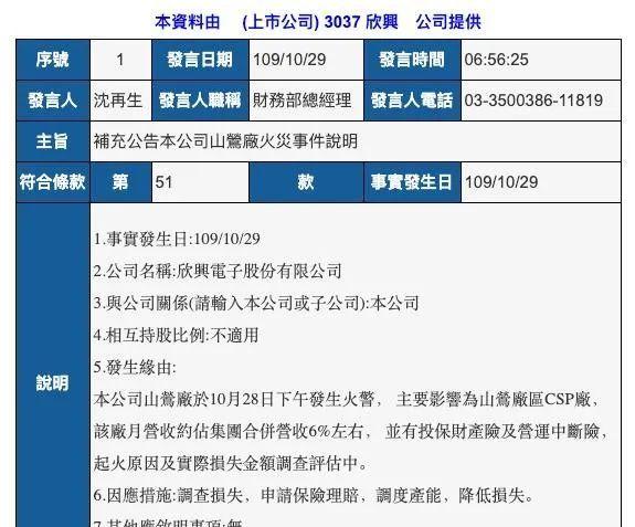 日前,苹果供应商欣兴电子在台湾证券交易所发布声明称,该公司位于台湾地区北部桃园市CSP厂10月28日下午发生了火灾。该厂月营收约占集团合并营收6%左右, 并有投保财产险及营运中断险,起火原因及实际损失金额调查评估中。公司将调查损失、申请保险理赔、调度产能、降低损失。