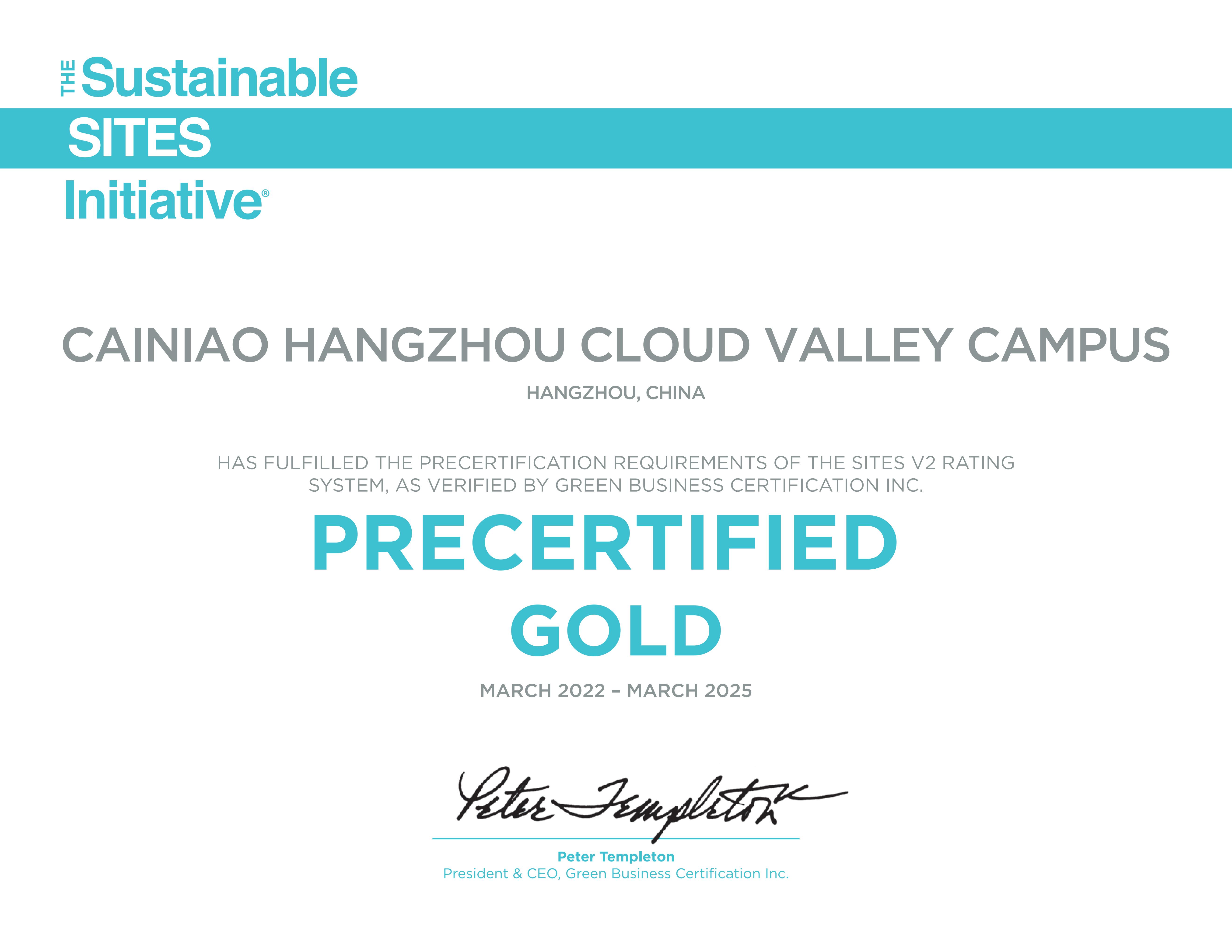 SITES是国际上公认权威的综合评价可持续发展场地建设和运营认证体系,被SITES认证,意味着成为了全球可持续景观场地示范案例。通过48个评分项,将给予认证级、银级、金级、铂金级认定,菜鸟云谷获得了金级的预认证。目前,在亚洲区域,已有2022东京奥运会运动员村、中国香港的星光大道等项目荣获该金级认证。