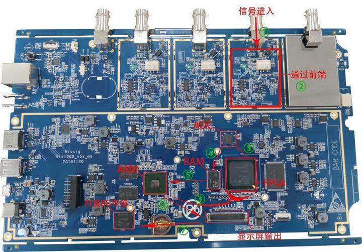 数字示波器很多时候都被叫做数字存储示波器,因为数字示波器中重要的一环,就是把ADC采集的数据存储起来。现代数字示波器采集数据的主要过程我们通过这块麦科信STO1104C智能示波器的主板进行直观了解: