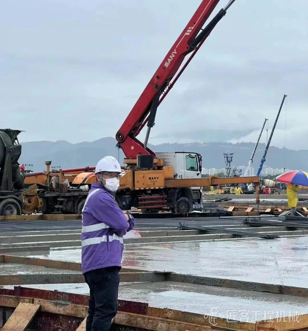 来自山东的史之方,如今已在方舱医院的一线施工现场工作了近一个月的时间,负责操作三一泵车浇灌地基。