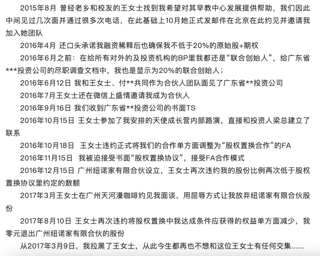 3月18日,前合伙人李晓艳发布长文,详述了她运用自己的资源帮助王荣辉拿到投资后,立刻被踢出了项目,承诺的股份、谈的合作条件等均未兑现,此后还有很多合作人也连续被踢出了公司。