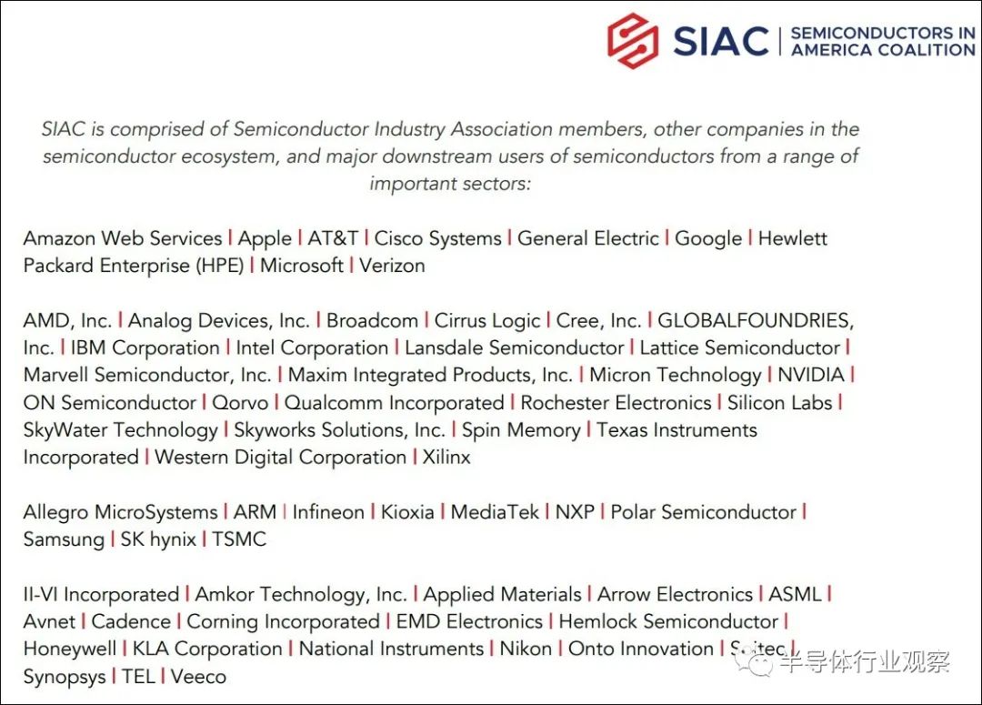 据观察者网报道,去年5月11日,包括美国、欧洲、日本、韩国、中国台湾地区等地的64家企业宣布成立美国半导体联盟(Semiconductors in AmericaCoalition,SIAC)。这些企业几乎覆盖整个半导体产业链,而他们组织在一起的第一件事,就是敦促美国国会通过拜登政府提出的500亿美元半导体激励计划。
