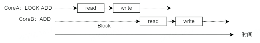 那怎么解决这个问题呢?既然 ADD 指令在硬件上不是原子的,那么就从软件上加锁来实现原子操作,使 CoreB 的的内存操作在 CoreA 的内存操作完成前不能执行。