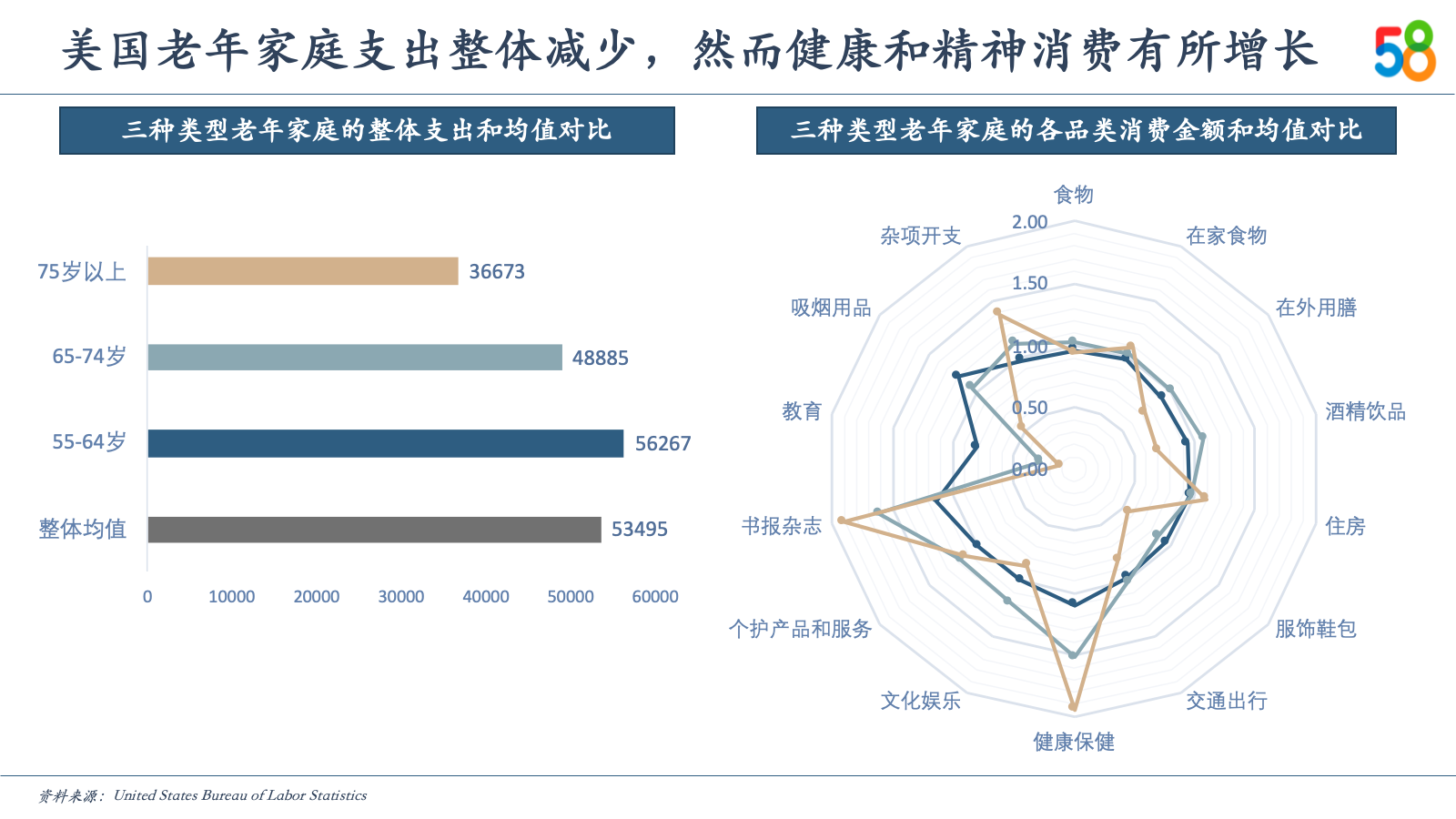 从美国经验来看,整体美国家庭年支出为5.3万美元,随着老龄化演进,年纪越大的老人家庭支出骤然减少(-30%),而黄金、活力老人(55-64岁)的消费金额高于均值(+5%)。从各品类消费金额来看,整体消费支出下降,食衣住行老年人都比年轻人花的少;但是健康保健、文化娱乐、书报杂志、个护产品却金额增加,其中健康保健的金额最为高,而退休金和保险在黄金年龄段增幅显著,健康险为养老生活提供保障;从各品类消费比例来看,食物没有变化,但是在外用膳比例下降;住房、交通没有变化;酒精和服饰减少;健康保健、书报杂志增幅最猛,说明老年人身体和精神的需求最为突出。