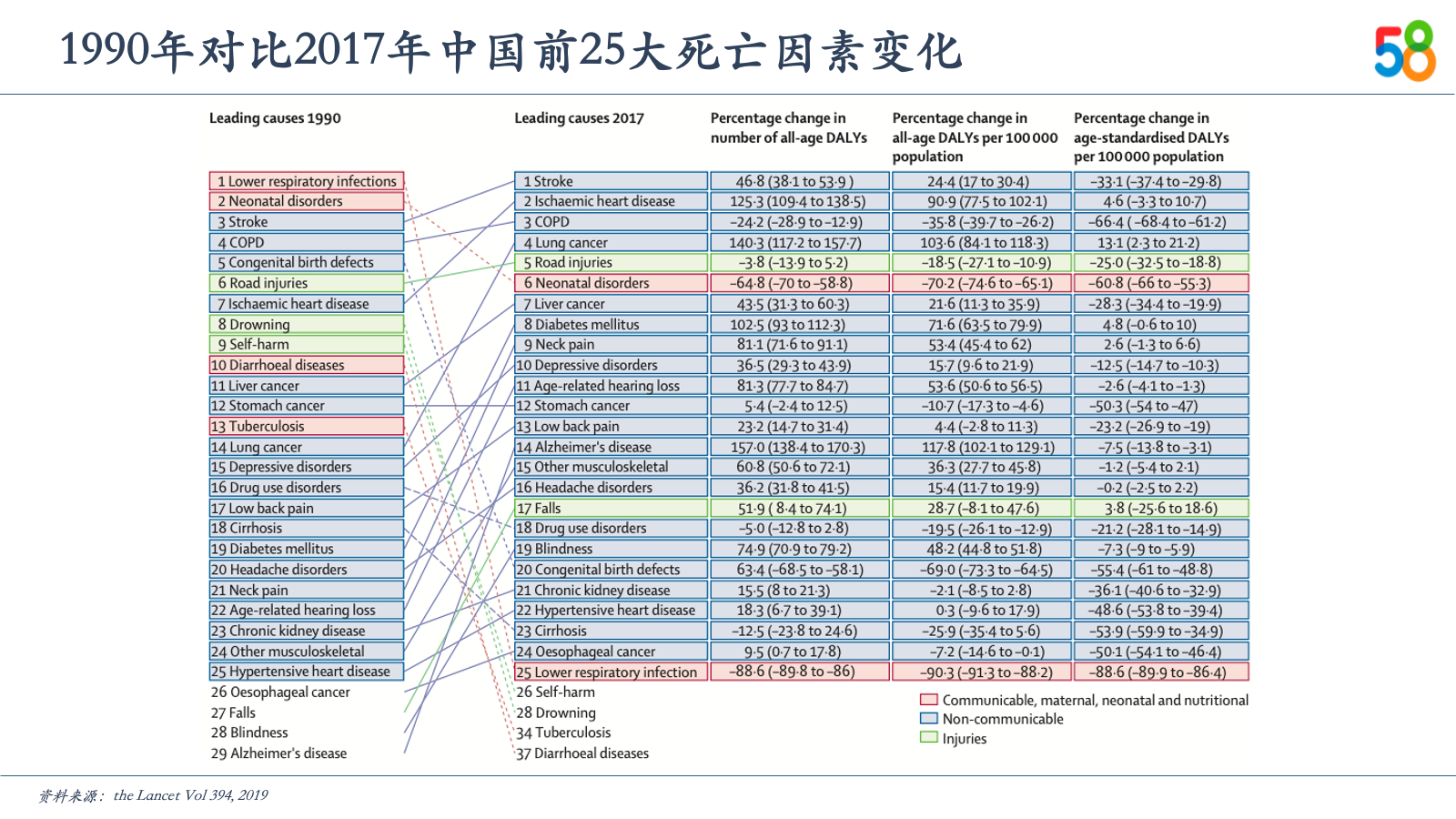 什么不变:脑血管疾病和慢性阻塞性肺疾病是近30年来前五大死因;脑卒中和三高息息相关,过去为老人病,但随着饮食结构变化,中风越来越年轻化;慢性阻塞性肺疾病和吸烟、空气污染、长期曝露在煤矿、棉絮等污染环境有关,空气质量是我国一直在优化的指标