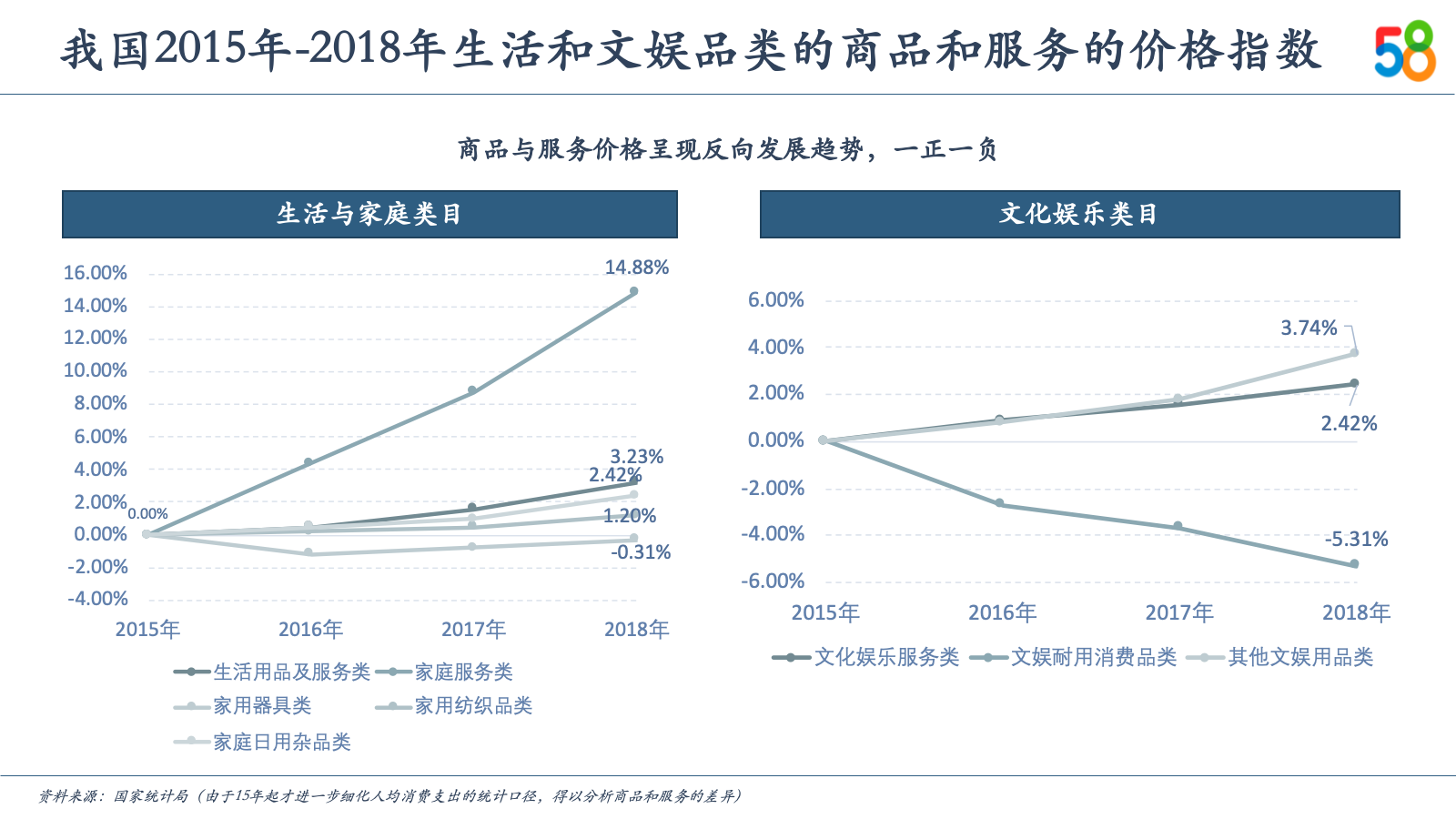 从我国近20年的数据来看,整体“服务”价格的增幅皆高于“商品”。以生活与家庭和文化娱乐类目为例: