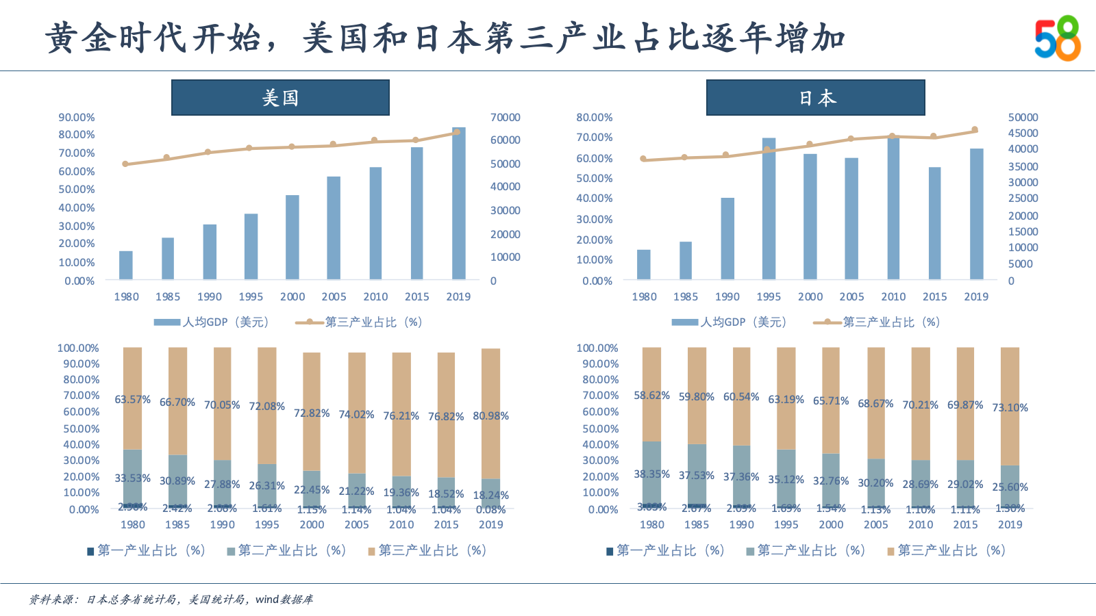 从美国经验来看,黄金时代后以信息产业为代表的高新技术产业迅速发展,并且带来二产(制造业等)传统观念部门的技术改造,使得三产(不产生物质的服务业)在1990年的GDP占比便超过70%。从日本经验来看,和德国类似,不同于美国重心放在信息产业,而是二产(制造业等)GDP占比稳定在20-30%,三产慢慢增长,2000年达到超过65%的水平。