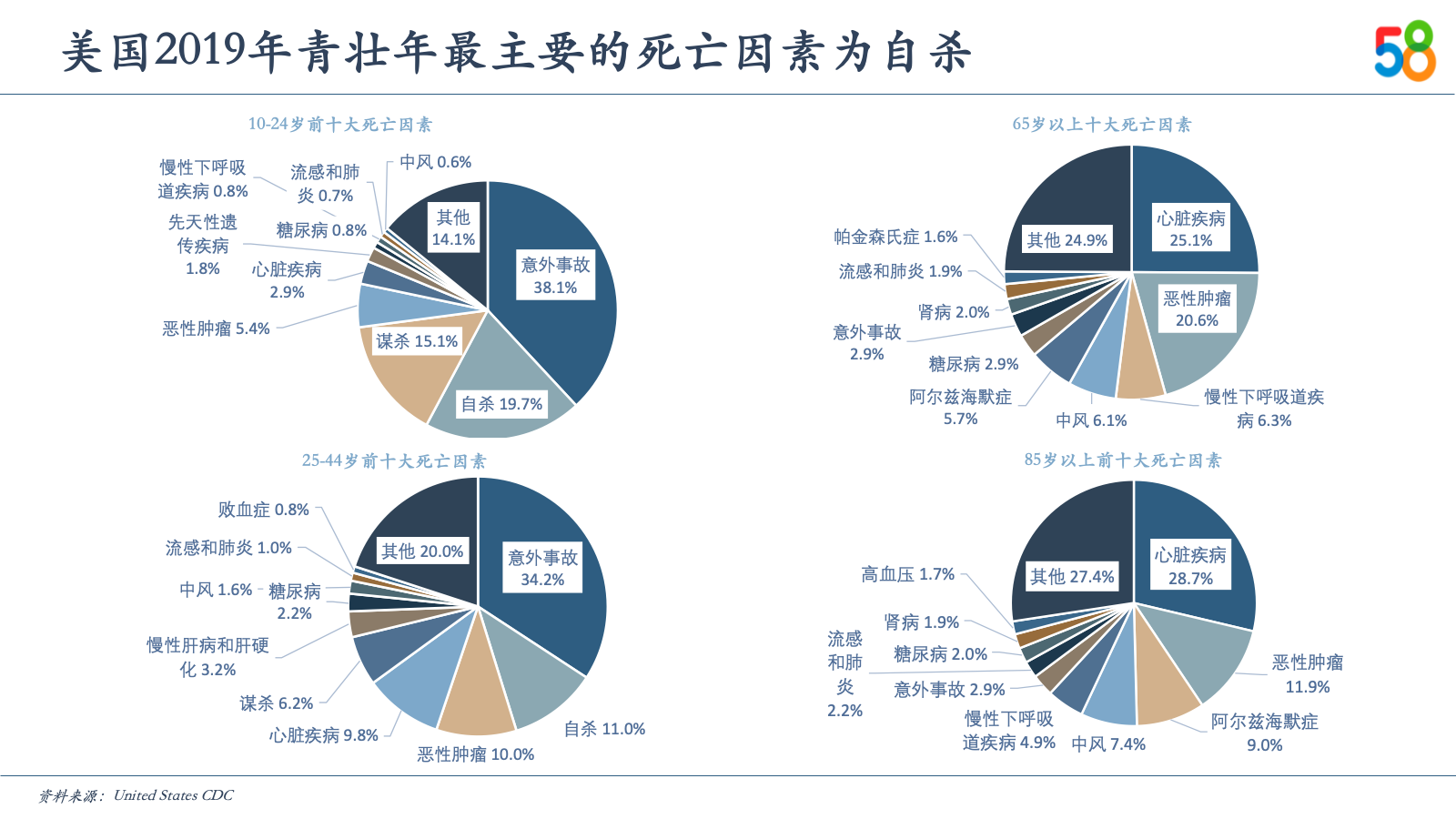 美国主力青壮年(10-44岁):排除意外事故,最主要的死亡因素为自杀,间接显示了为什么近年来美国如此重视精神健康。科技与信息技术的发展,带来人类精神熵的加剧