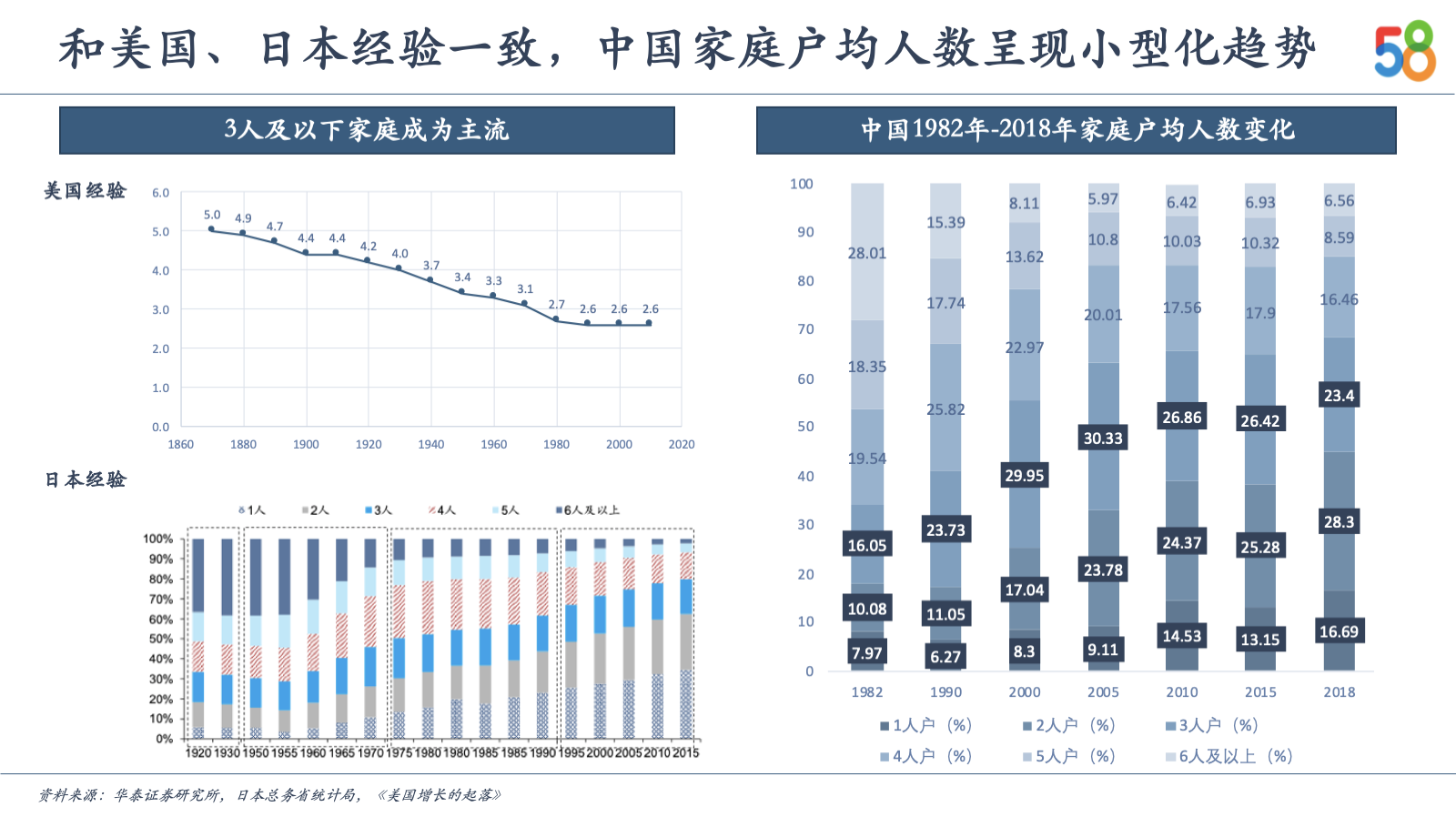 从美国经验来看,随着城镇化进程,美国家庭平均人数从1880年的4.9人下降到2010年的2.6人。下降降速度较快的是1920-1960年之间,随着1990年后陆续有生育政策落地,保持在2.6人水平。从日本经验来看,区别于战后婴儿潮1945年-1974年以4人户以上的家庭为主,1975年(即当前中国对标的锚点)1人户-2人户的家庭大幅增长,从1975年的30%增长到1990年的43%,当前日本已进入单身社会,1人户家庭占比超过34%。