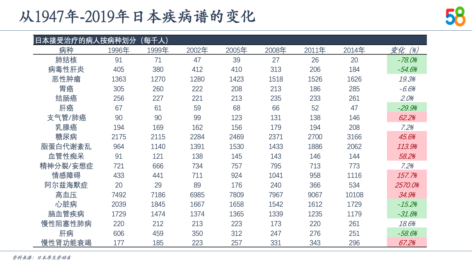 什么缓解:和美国经验类似,肺结核从前五大死因退出,得利于近年来疫苗和公共卫生的发展;肝病也随着医疗技术发展逐渐得以控制;和其他国家不同的是,日本脑血管疾病的比例则是逐年下降