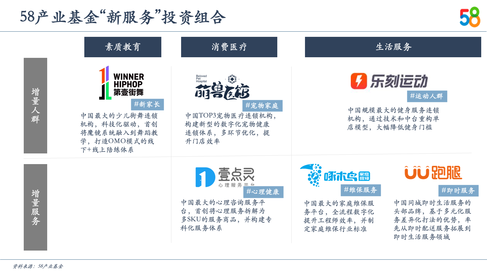 以上是58神骐新服务团队预测的未来10年中国“新服务消费”的10大趋势,我们长期追踪生活服务、健康服务等细分赛道,在这些领域,我们也进行了部分布局: