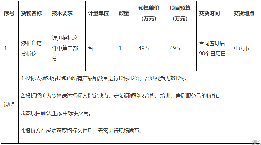 近日,受重庆市物资采购中心委托,公诚管理咨询有限公司发布采购液相色谱分析仪的招标公告,项目的潜在投标人应在重庆市渝北区金开大道56号两江天地2单元7楼 获取招标文件,并于2022年05月31日 14点00分(北京时间)前递交投标文件。