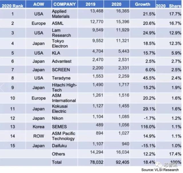 美国半导体产业调查公司VLSI Research公布的2020年全球TOP15半导体设备厂商销售额排行榜显示,这十五大半导体设备厂商当中,有7家是来自日本,有4家来自美国(这4家均在前8厂商当中,并且其中应用材料和泛林集团分别占据了第一和第三),这也反应了美国和日本在半导体设备领域的强大优势。有2家是来自欧洲,但是排名第二的ASML是全球最大的光刻机厂商,并且也是全球唯一一家EUV光刻机供应商。