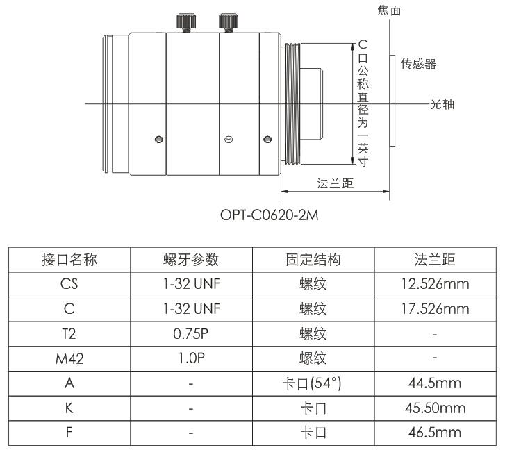 镜头与相机连接的机械接口,行业内常用的光学接口已形成通用规范,例如C口、CS口、F口和K口。