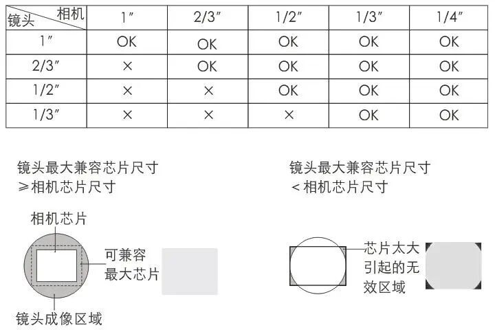 b.最大兼容相机芯片尺寸最大兼容相机芯片尺寸指镜头能支持的最大清晰成像的范围。在实际选择相机和镜头时,要注意所选择镜头的最大兼容芯片尺寸要大于或等于所选择的相机芯片的尺寸。以下为常用镜头及相机芯片的兼容性说明: