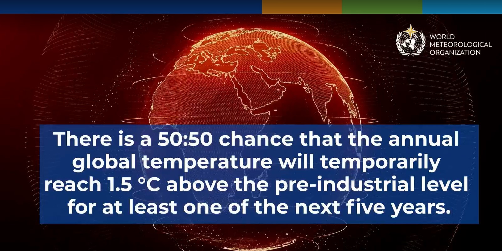 世界气象组织指出,2022年至2026年间至少有一年有93%的可能性成为有记录以来最热的一年,并将2016年赶下榜首。根据英国气象局作为世界气象组织此类预测牵头中心制作的《全球一年期至十年期气候最新通报》,2022年至2026年的五年平均值高于过去五年(2017年至2021年)的概率也是93%。