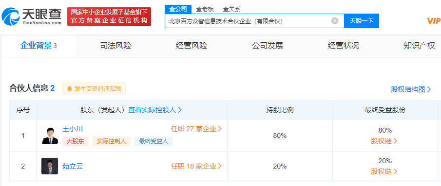 天眼查App显示,近日,北京百方众智信息技术合伙企业(有限合伙)成立,执行事务合伙人为搜狗公司原CEO王小川,经营范围含人工智能基础软件开发;计算机系统服务;人工智能应用软件开发等。合伙人信息显示,该企业由王小川,原搜狗COO茹立云共同持股。