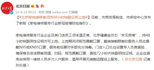 家电维修服务行业企业及其门店员工须体温正常、北京健康宝状态“未见异常”、持48小时核酸阴性证明方可上岗。上岗期间须规范佩戴口罩,直接接触顾客的服务人员应佩戴N95或KN95口罩,服务前后要对手部充分消毒。门店入口处应设置专人负责查验,确保每名进店顾客测温、扫码、规范佩戴口罩、查验72小时内核酸阴性证明。企业应避免安排同一维修人员多次入户服务,倡导开展无接触远程线上服务。