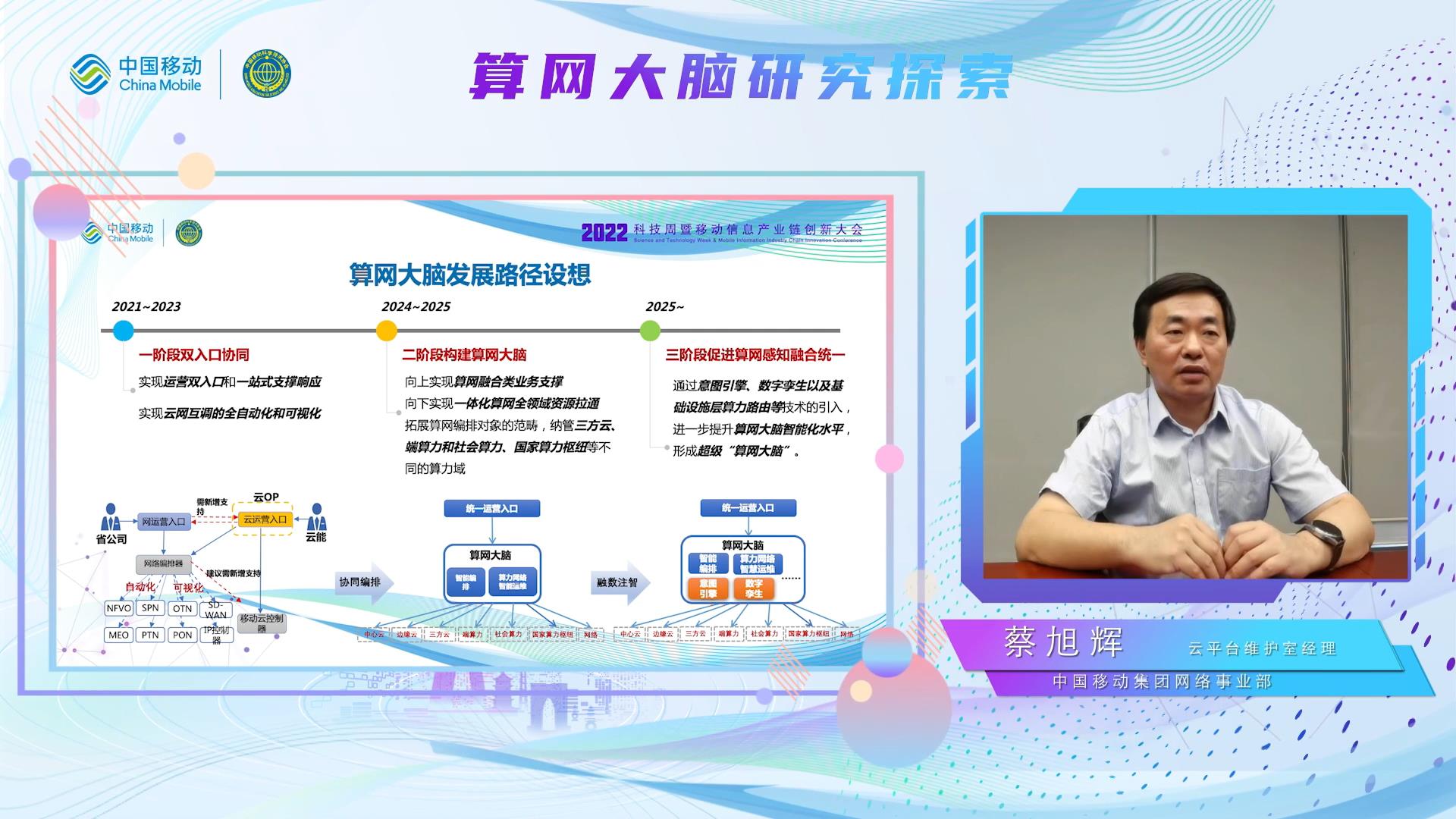 C114讯 6月23日消息(水易)日前,2022年科技周暨移动信息产业创新大会正式召开,同期举办的以“算网融合,引领数智未来”为主题的“算网大脑分论坛”上,中国移动网络事业部云平台维护室经理蔡旭辉介绍了中国移动在算网大脑的探索研究。