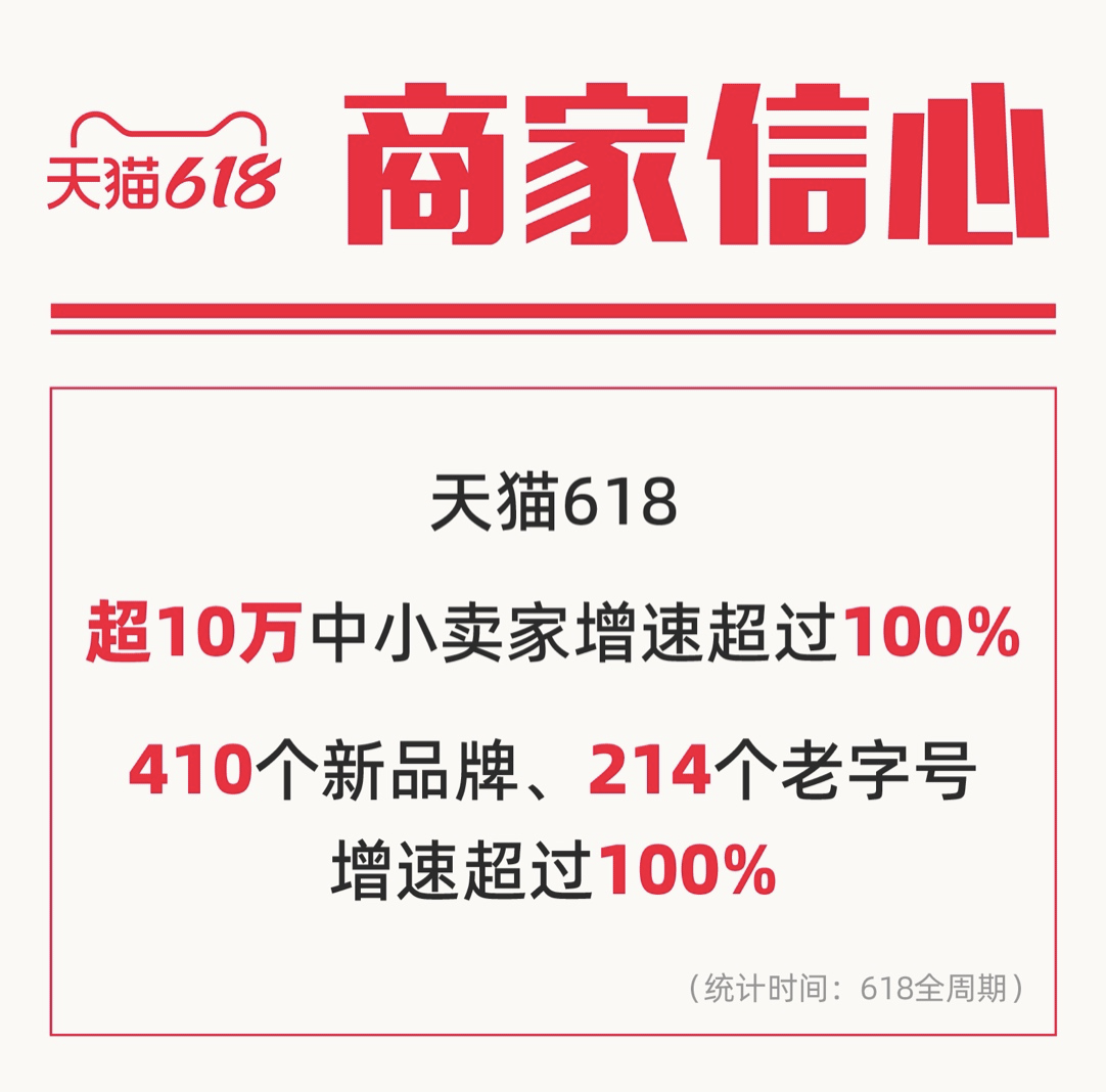 据悉,今年天猫618共有超过26万品牌参加,出现了近300个成交额过亿的品牌,100个成交额过亿的单品。同时,中小商家的创业热情被激发,有超10万中小卖家增速超过100%。