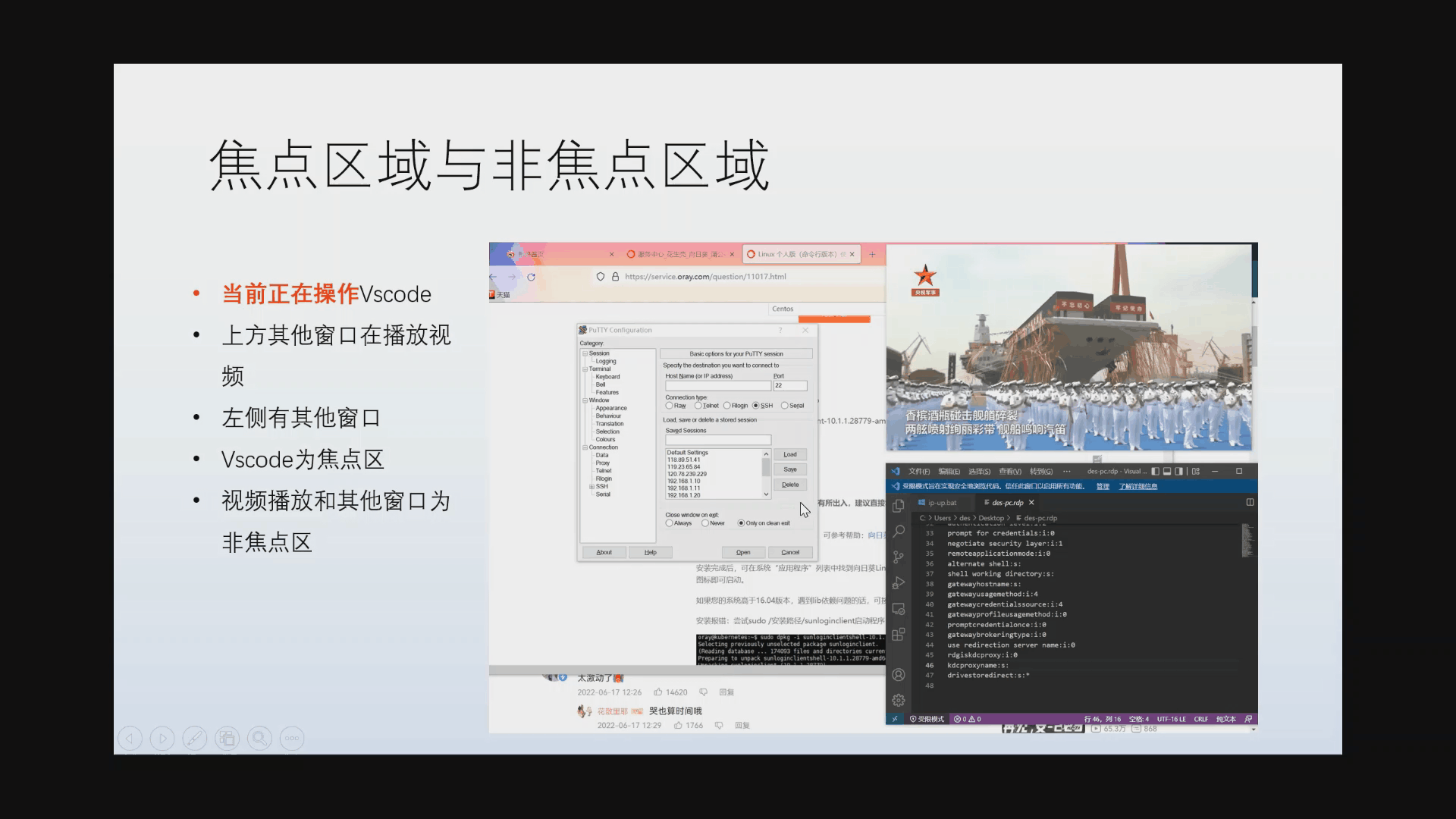 根据当前激活的窗口窗体,被控端向日葵绘制用户的关注区,结合用户的键盘鼠标动作和光标位置,进一步确定焦点区。编码时,在指定的比特率下,为焦点区分配更多的比特使它更清晰,同时,降低非焦点区的编码复杂度,减小比特分配,节省编码时间。在下面的示例中,当前正在使用vscode编辑文档,同时有其他程序在播放视频。根据上述原则,向日葵划分了焦点区。