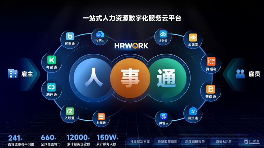 HRWORK人事通是云生集团打造的一站式人力资源数字化服务云平台,定位为人力资源科技+民生服务平台,为企业客户提供覆盖招聘、背调、入职、薪资、社保、培训等人力资源管理全环节的SaaS产品,包括招聘云、背调通、测评通、考试通、入职通、薪资通、个税通、社保通、普保通、真福利、法务云、云课堂、共管云等,为企业提供一站式人力资源科技解决方案服务,帮助企业实现数字化人力、管理合规、降本增效。