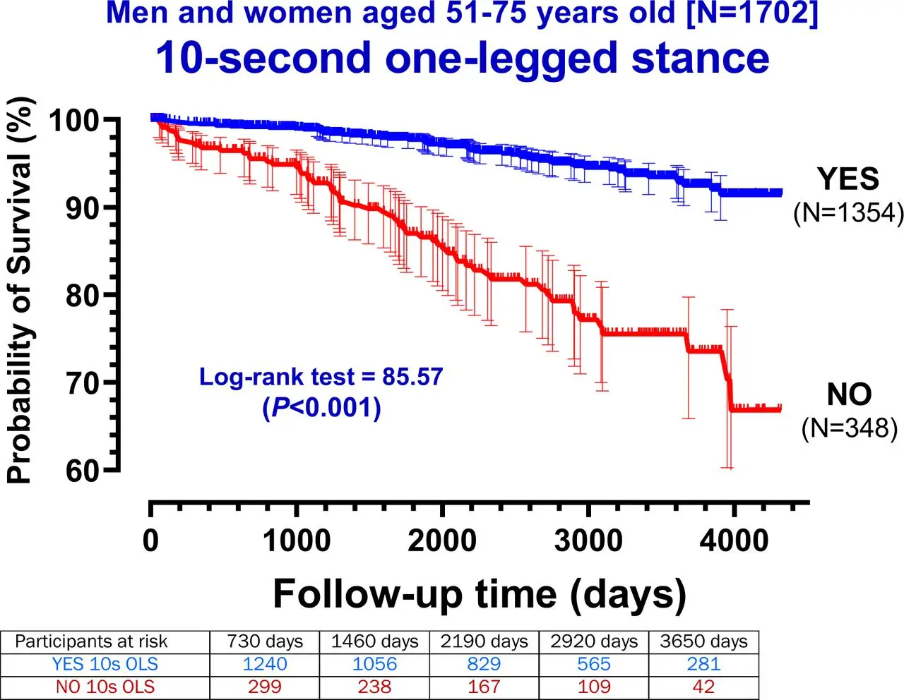 目前的分析包括 2009 年 2 月至 2020 年 12 月期间首次检查时年龄在 51-75 岁(平均 61 岁)的 1702 名参与者。大约三分之二 (68%) 是男性。作为检查的一部分,参与者被要求在没有任何额外支撑的情况下单腿站立 10 秒钟。