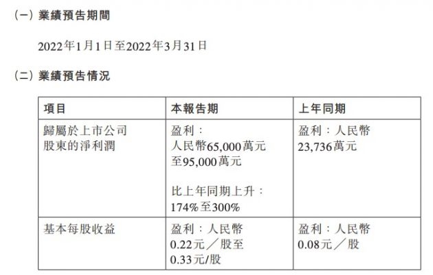 4月19日消息,比亚迪发布2022年第一季度业绩预告,归属于上市公司股东的净利润6.5亿元至9.5亿元,同比增长174%至300%。
