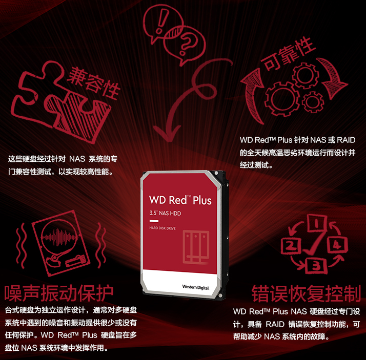 目前市面中NAS专用硬盘不少,以WD Red HDD为例,不仅兼容性、可靠性有保障,还有诸如噪声振动保护、错误恢复控制的功能保障。