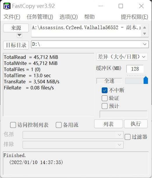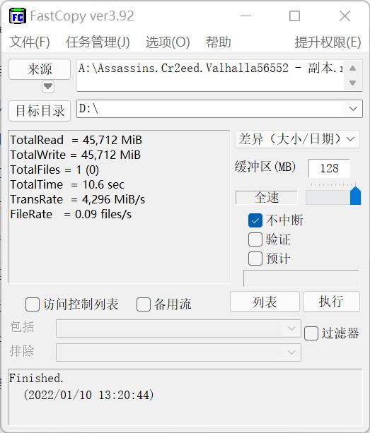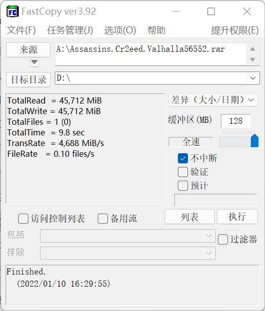 在FastCopy的测试中,铠侠EXCERIA Pro SE10传输一个45.7GB的文件,用时仅需9.8秒,平均传输速度也达到了4688MB/s,比三星980Pro以及英睿达P5 Plus更加出色,在实际文件拷贝中取得领先。