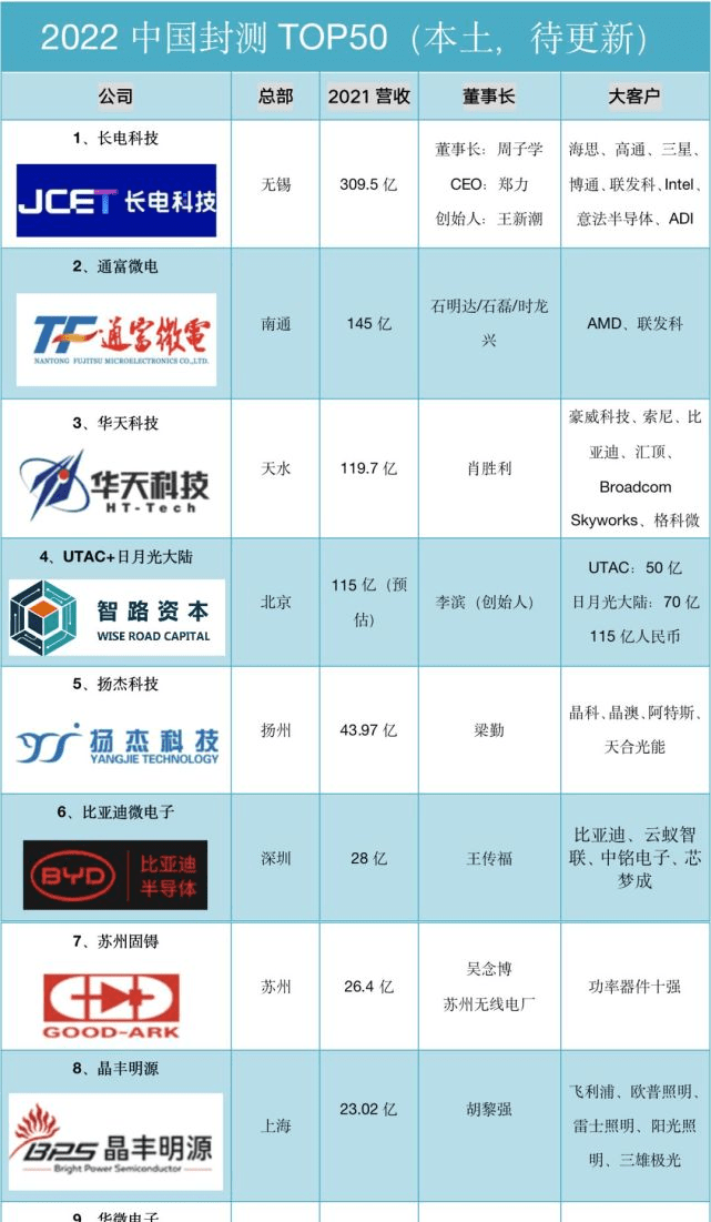 排名第一的就是长电科技,长电科技自2003 年 6 月长电科技在上交所 A 板挂牌上市后,成为中国半导体封装第一家上市公司。