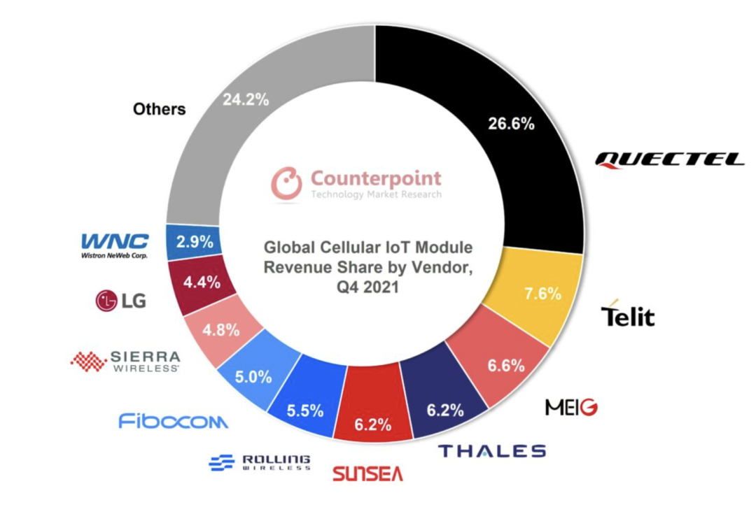 全球蜂窝物联网模组各供应商收入份额,2021年Q4ghIesmc