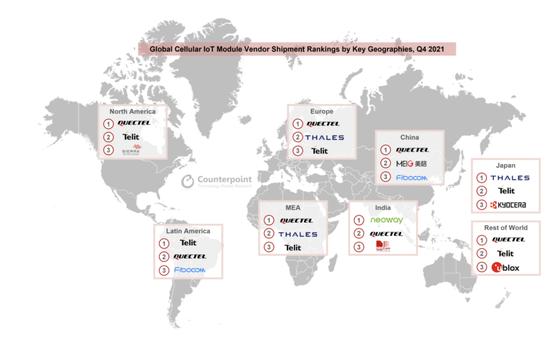 在评论模组供应商的区域表现和定价动态时,研究副总裁Neil Shah表示:"随着上季度该领域的国际竞争者的疲软表现后, 2021年Q4强势回归。就收入而言,Quectel、MeiG和Sunsea是中国前三大蜂窝物联网模组品牌。对于世界其他地区而言,Quectel,Telit和Thales是前三大蜂窝物联网模组品牌。"ghIesmc