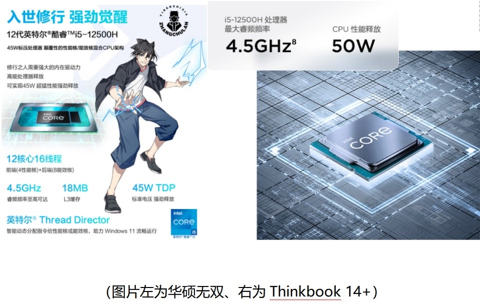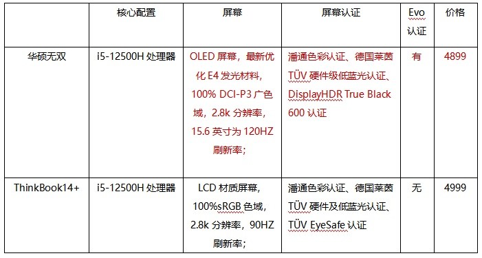 华硕无双与ThinkBook14+搭载的处理器都是最新的12代酷睿标压处理器,不同的是无双首批上市的只有i5-12500H,ThinkBook14+最高可选i7-12700H,价格会随之高出一千左右。