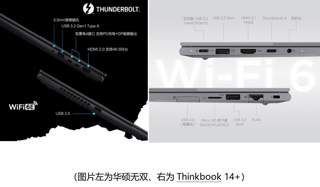 在接口方面,两款笔记本都有HDMI2.0、雷电4等接口,Thinkbook 14+多了一个rj45网线接口,但是华硕无双却是拥有2个雷电4的接口,外接显示器和显卡坞也更加的方便,拓展性更强一筹。