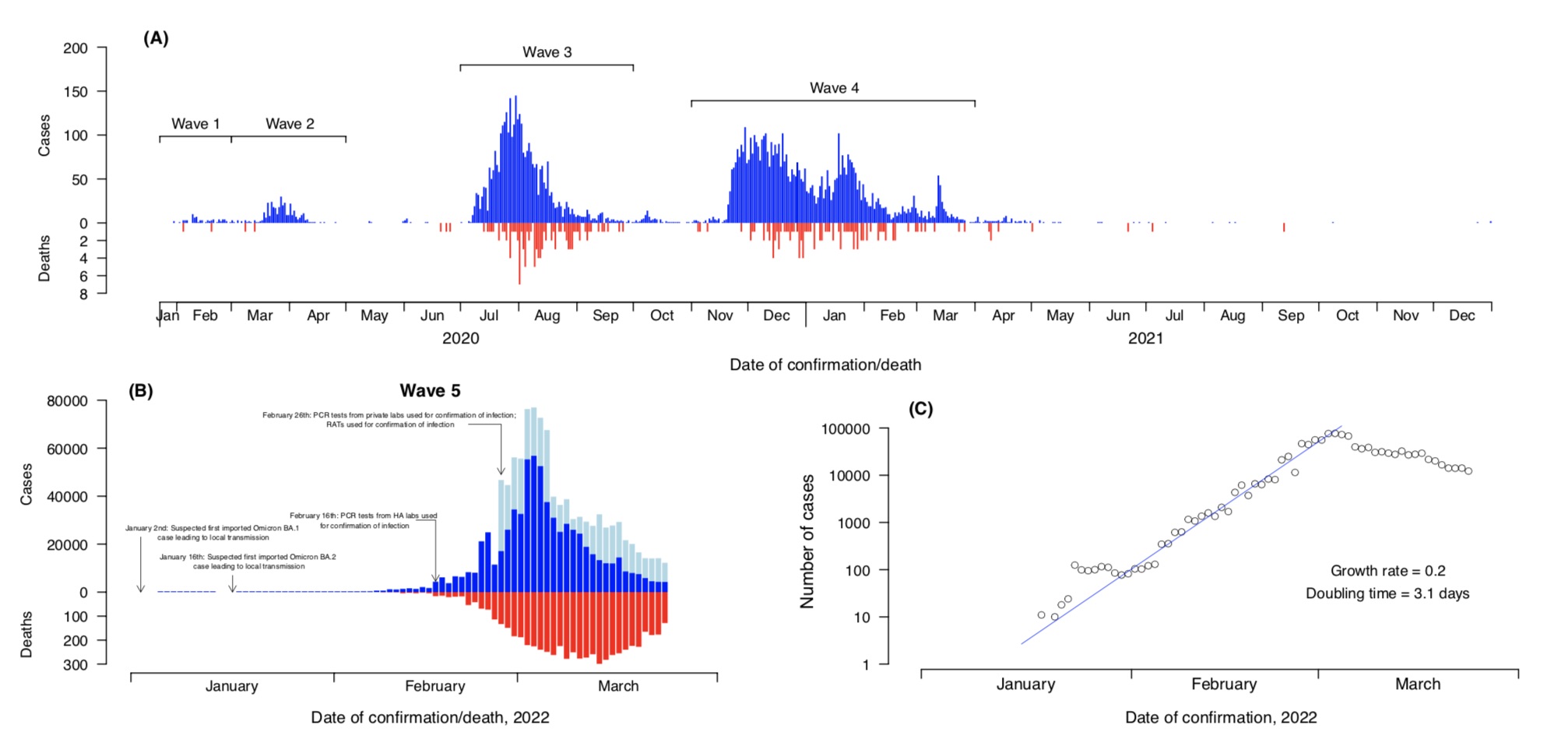 在第五波疫情中,香港感染人数达到历史最高水平,官方报告的确诊病例超过110万例。通过RT-PCR核酸检测和快速抗原检测发现的每日病例数在3月4日达到峰值。而此前经历了长达一个多月的指数增长,翻倍时间为3.4天。