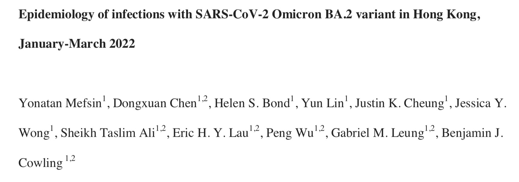 该研究于近日发表在预印本网站medRxiv上,题为“2022年1-3月香港地区SARS-CoV-2奥密克戎突变株感染的流行病学研究”(Epidemiology of infections with SARS-CoV-2 Omicron BA.2 variant in Hong Kong, January-March 2022)。研究团队来自香港大学公共卫生学院、世卫组织传染病流行病学和控制合作中心、香港健康数据发现实验室。