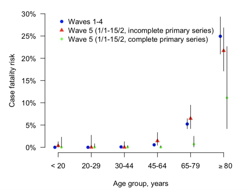 值得关注的是,他们估计,在第五波疫情中未完成初级系列疫苗接种的病例的年龄特异性病例死亡风险(CFR)与所有年龄组中第一波至第四波中的病例死亡风险相似。