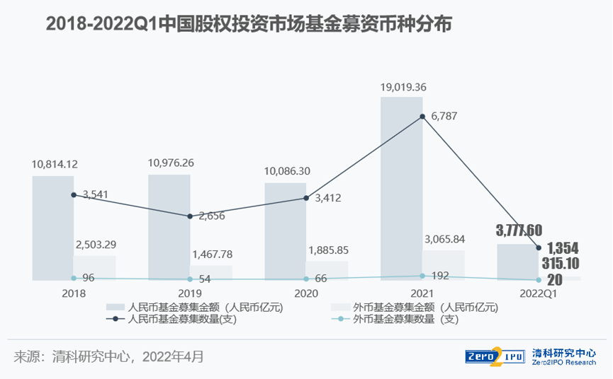一切都体现在数据上。清科研究中心数据显示,外币基金方面,2022年第一季度共20支外币基金发生新一轮募集,同比下降57.4%;披露募集金额约315.10亿元人民币,同比下降幅度达62.6%。这意味着,今年一季度美元募资减少约6成。