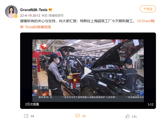 ( 快科技 ) 4 月 19 日消息,特斯拉对外事务副总裁陶琳对外发声称,特斯拉上海超级工厂今天顺利复工。据媒体报道,特斯拉上海超级工厂已经有 8 千名员工到场,电池电机产线已经开始全速生产,整车产线也在逐步恢复。