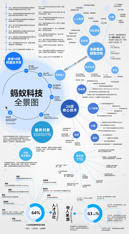 统计显示,截至2020年6月底,蚂蚁超过1.6万名员工中,技术研发人员占比已经超过64%;在蚂蚁集团董事会中,有1/3是技术背景出身,分别为胡晓明(蚂蚁集团CEO)、程立(阿里巴巴CTO)和倪行军(蚂蚁集团CTO)。