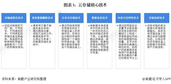 云存储的核心技术主要包括虚拟化技术、重复数据删除技术、分布式存储技术、数据备份技术、内容分发网络技术和存储加密技术。云存储利用这些核心技术将网络中大量各种不同类型的存储设备通过应用软件集合起来协同工作,共同对外提供数据存储和业务访问功能,从而保证数据的安全性,并节约存储空间。