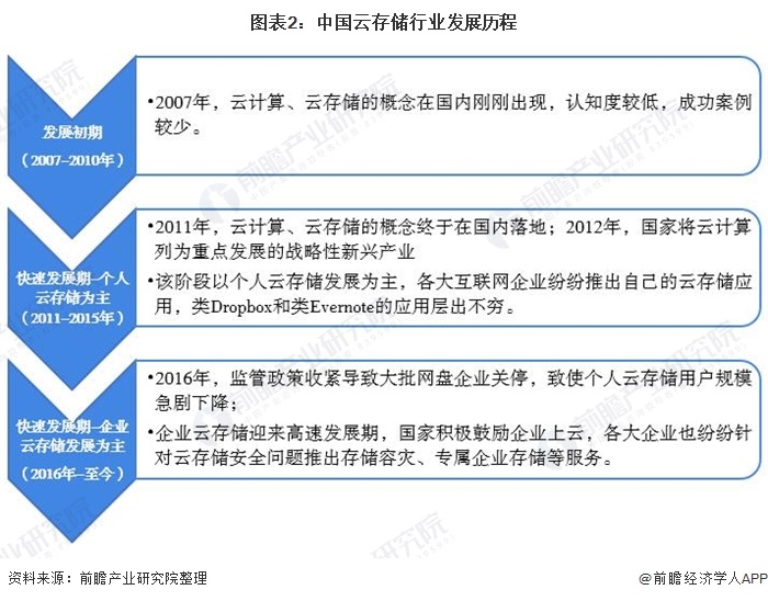 我国云存储行业的发展可以追溯到2007年,云计算、云存储的概念在国内开始出现。2011年,云计算、云存储的概念落地;2012年,国家将云计算列为重点发展的战略性新兴产业,各大互联网企业纷纷推出自己的云存储应用,类Dropbox和类Evernote的应用层出不穷。该阶段云存储的发展以个人云存储发展为主。