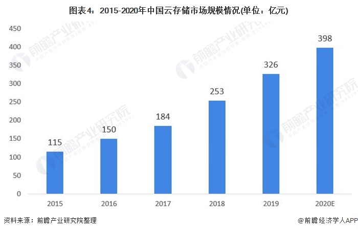 从整体市场规模看,2015年我国云存储市场规模约为115亿元,2019年我国云存储市场规模已经达到了326亿元。2020年,海量数据的持续增长进一步推动了我国企业对云存储的需求,2020年我国云存储市场规模预计接近400亿元。