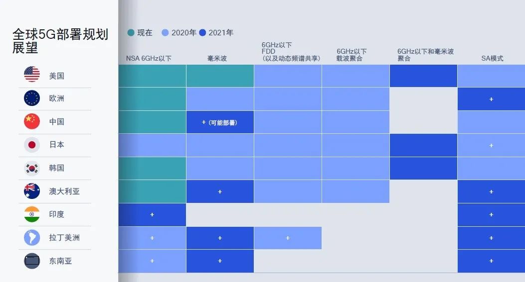 频段的使用需要国家来划分,频段就绪也需要一定的时间,所以在5G部署初期不同国家频谱的使用不同,毫米波和6GHz以下频段部署的时间也不同,例如目前美国已经率先部署毫米波。2020年还会有更多的5G的频谱组合和技术将在全球范围内部署,NSA 6GHz以下TDD会在包括日本、拉丁美洲、东南亚等地区部署,毫米波也会在欧洲一些国家(俄罗斯、意大利的一部分)以及日本和韩国部署。由于6GHz以下FDD频段目前绝大部分被4G占用,2020年之后将逐步释放并部署5G,所以在2020年绝大部分国家都进行了FDD的实验和部署。