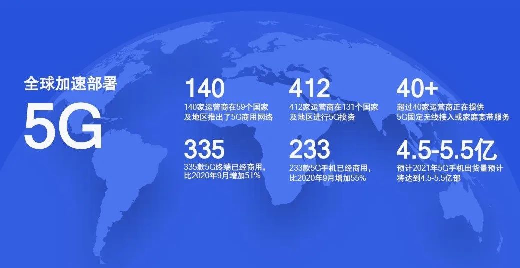 尽管受到疫情的影响,但5G在全球加速部署的趋势并未停止。最新数据显示,目前,全球已有140家运营商在59个国家及地区推出了5G商用网络,412家运营商在131个国家及地区进行了5G投资。值得一提的是,超过40家运营商正在提供5G固定无线接入或家庭宽带服务,以充分发挥5G高带宽的特性。