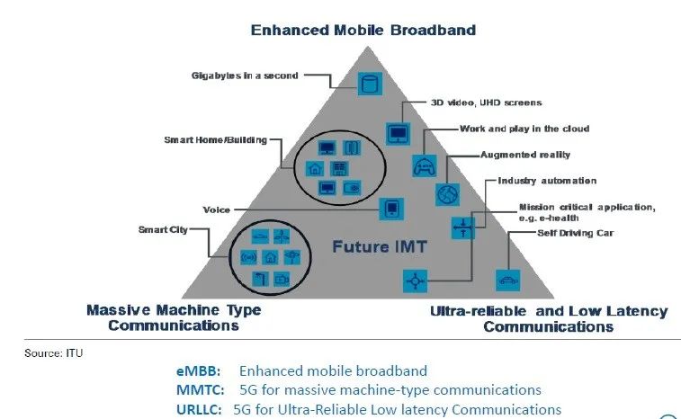 众所周知,移动技术大约每十年完成一次代际演进,每一代移动技术的标准都建立在前瞻性基础科技研发的基础之上,5G也不例外。3GPP在2017年发布的5G标准的第一个版本Rel-15中,定义了三大应用场景:增强型移动宽带(eMBB)、超高可靠低延迟通信(URLLC)和海量物联网(mMTC),这也常常被业界称之为5G服务的“铁三角”,具体包括: