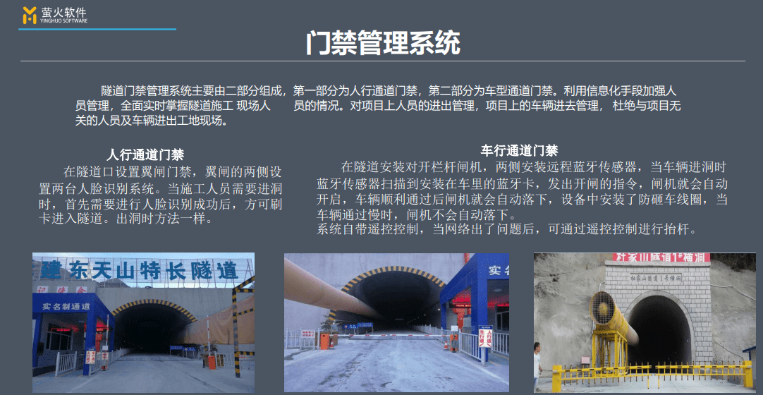 隧道门禁管理系统:主要由二部分组成,第一部分为人行通道门禁,第二部分为车型通道门禁。利用信息化手段加强人员管理,全面实时掌握隧道施工现场人员的情况,对项目上人员的进出时间和次数管理,项目上的车辆进入时间和次数的管理,杜绝与项目无关的人员及车辆进出工地现场。