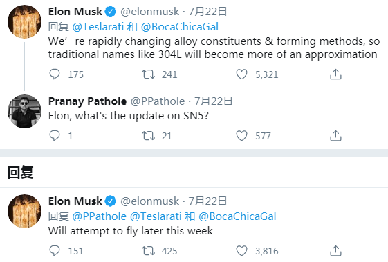 7月22日,伊隆·马斯克在回答 Twitter 网友提问时透露,星舰五号原型(SN5)已有相当重大的进展,最快有望在本周晚些时候试飞。作为承托私营航天企业 SpaceX 火星探索梦想的载体,星舰(Starship)五号原型计划实施 150 米(492 英尺)高的首次腾跃。对星舰比较关注的朋友,应该记得去年有一艘名叫“Starhooper”的试验飞船已经完成过类似的动作。